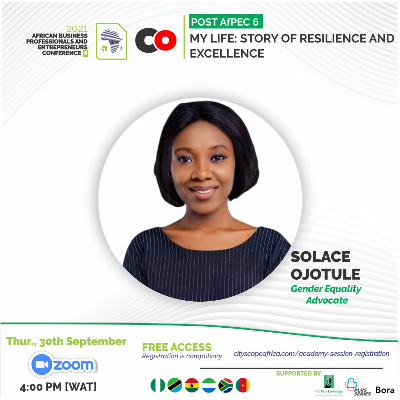 Join Solace Ojotule at the City Scope Africa Academy (an initiative of City Scope Africa) this month, via Zoom platform, as she shares her emotional story of unusual resilience through thick and thin, and eventual Excellence. You will find her strategies useful.